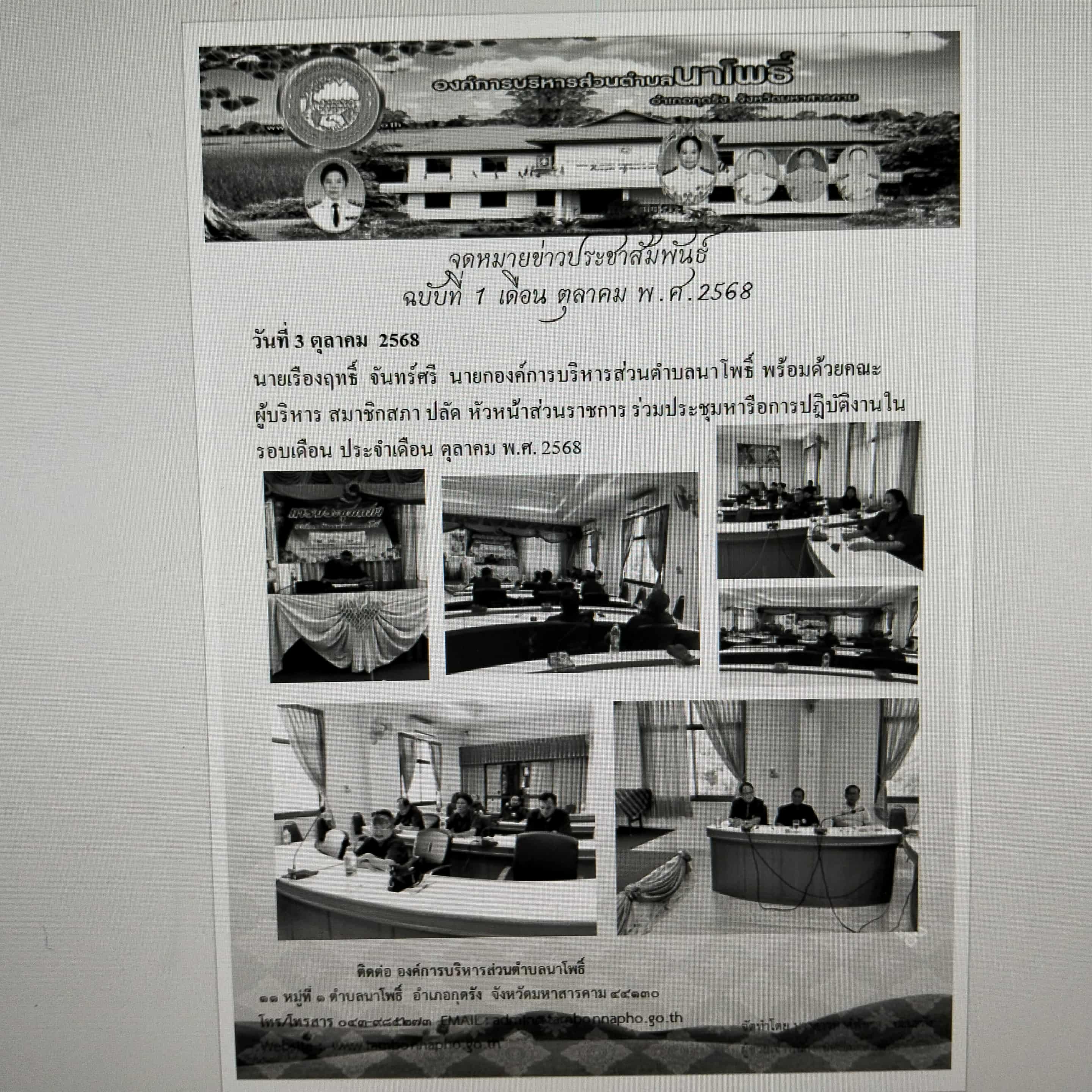 นายเรืองฤทธิ์ จันทร์ศรี นายกองค์การบริหารส่วนตำบลนาโพธิ์ พร้อมด้วยคณะผู้บริหาร สมาชิกสภา ปลัด หัวหน้าส่วนราชการ ร่วมประชุมหารือการปฎิบัติงานในรอบเดือน ประจำเดือน ตุลาคม พ.ศ. 2568
