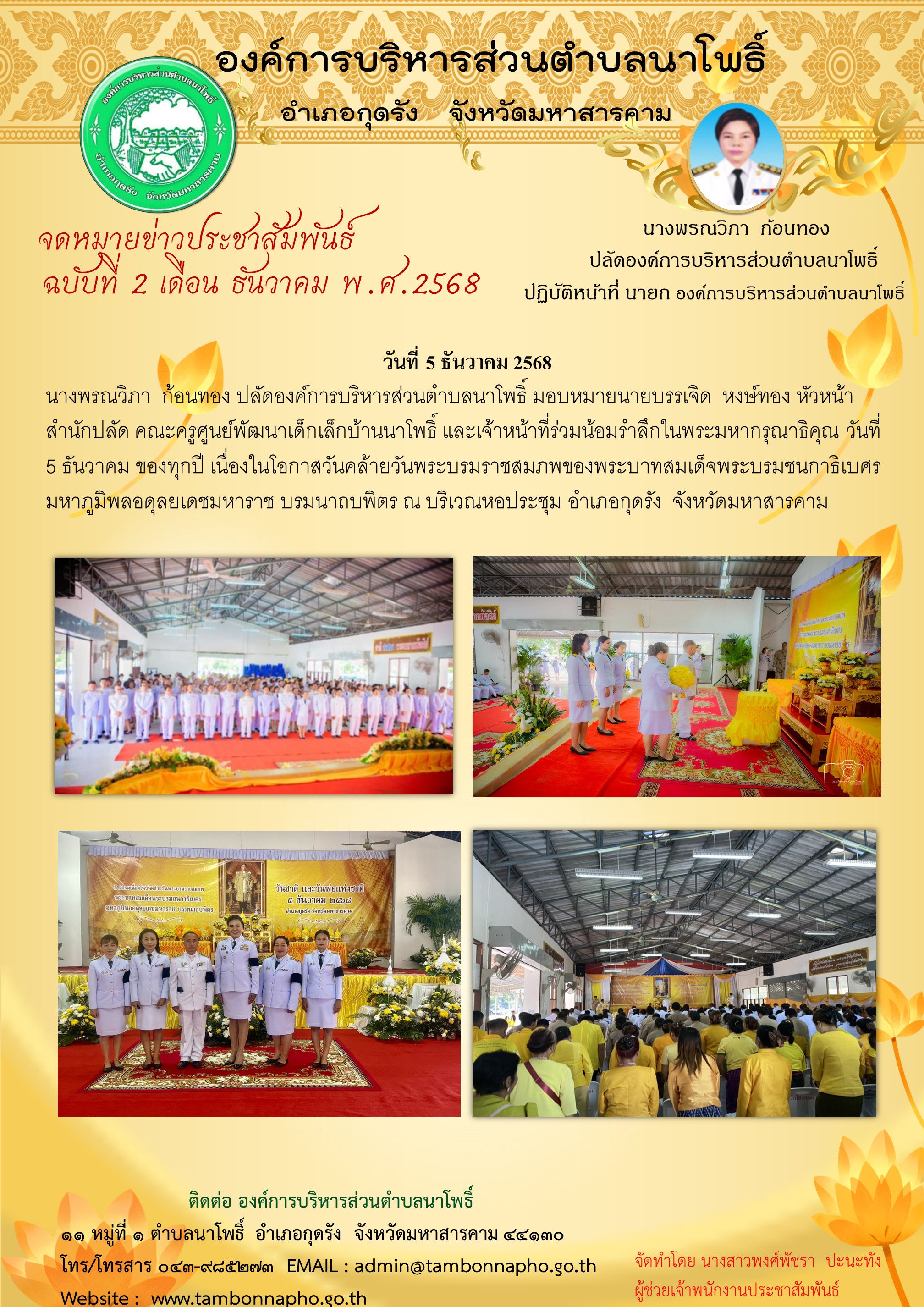 นางพรณวิภา ก้อนทอง ปลัดองค์การบริหารส่วนตำบลนาโพธิ์ มอบหมายนายบรรเจิด หงษ์ทอง หัวหน้าสำนักปลัด คณะครูศูนย์พัฒนาเด็กเล็กบ้านนาโพธิ์ และเจ้าหน้าที่ร่วมน้อมรำลึกในพระมหากรุณาธิคุณ วันที่ 5 ธันวาคม ของทุกปี เนื่องในโอกาสวันคล้ายวันพระบรมราชสมภพของพระบาทสมเด็จพระบรมชนกาธิเบศร มหาภูมิพลอดุลยเดชมหาราช บรมนาถบพิตร ณ บริเวณหอประชุม อำเภอกุดรัง จังหวัดมหาสารคาม