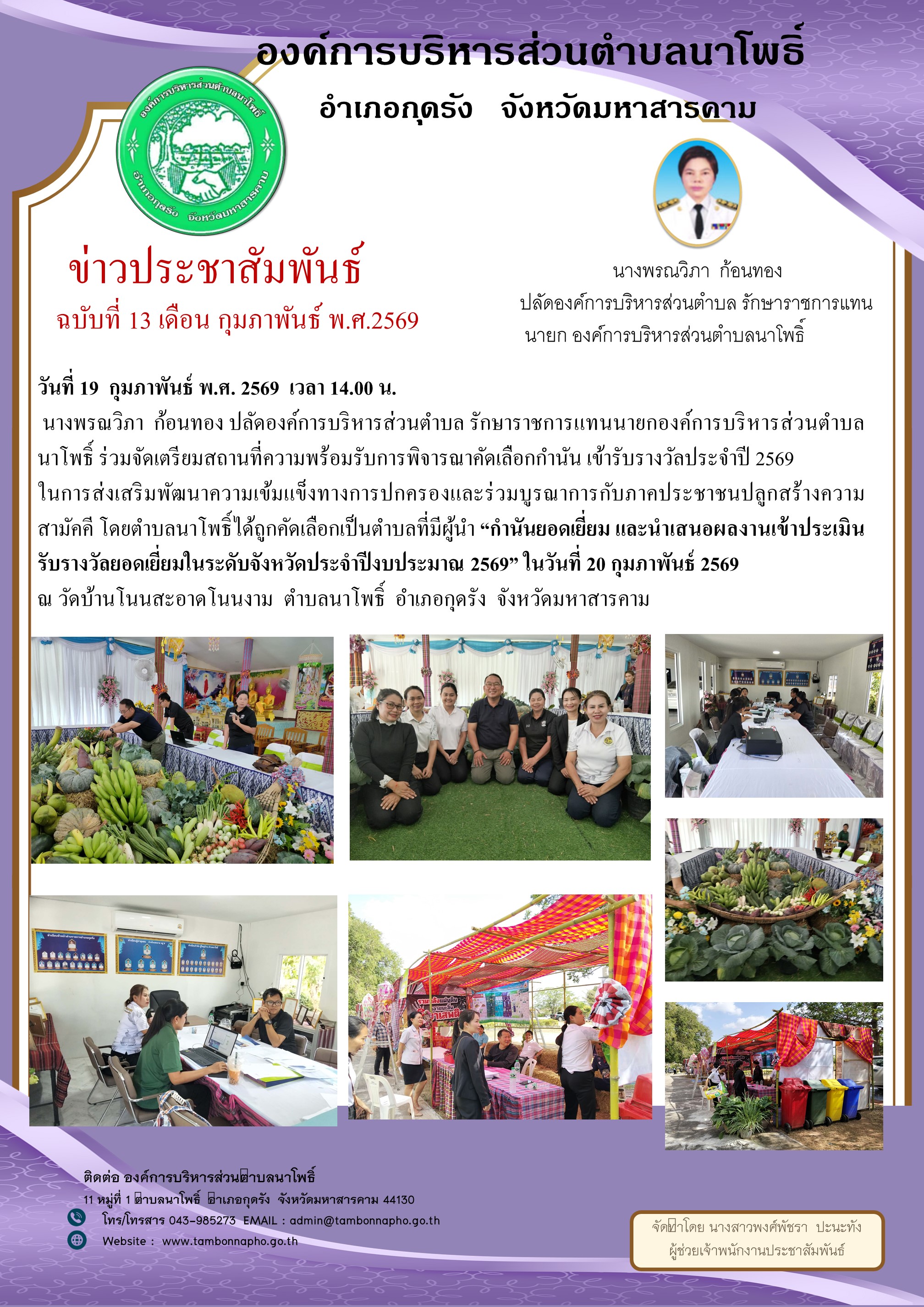 นางพรณวิภา ก้อนทอง ปลัดองค์การบริหารส่วนตำบล รักษาราชการแทนนายกองค์การบริหารส่วนตำบลนาโพธิ์ ร่วมจัดเตรียมสถานที่ความพร้อมรับการพิจารณาคัดเลือกกำนัน เข้ารับรางวัลประจำปี 2569 ในการส่งเสริมพัฒนาความเข้มแข็งทางการปกครองและร่วมบูรณาการกับภาคประชาชนปลูกสร้างความสามัคคี โดยตำบลนาโพธิ์ได้ถูกคัดเลือกเป็นตำบลที่มีผู้นำ “กำนันยอดเยี่ยม และนำเสนอผลงานเข้าประเมินรับรางวัลยอดเยี่ยมในระดับจังหวัดประจำปีงบประมาณ 2569” ในวันที่ 20 กุมภาพันธ์ 2569 ณ วัดบ้านโนนสะอาดโนนงาม ตำบลนาโพธิ์ อำเภอกุดรัง จังหวัดมหาสารคาม