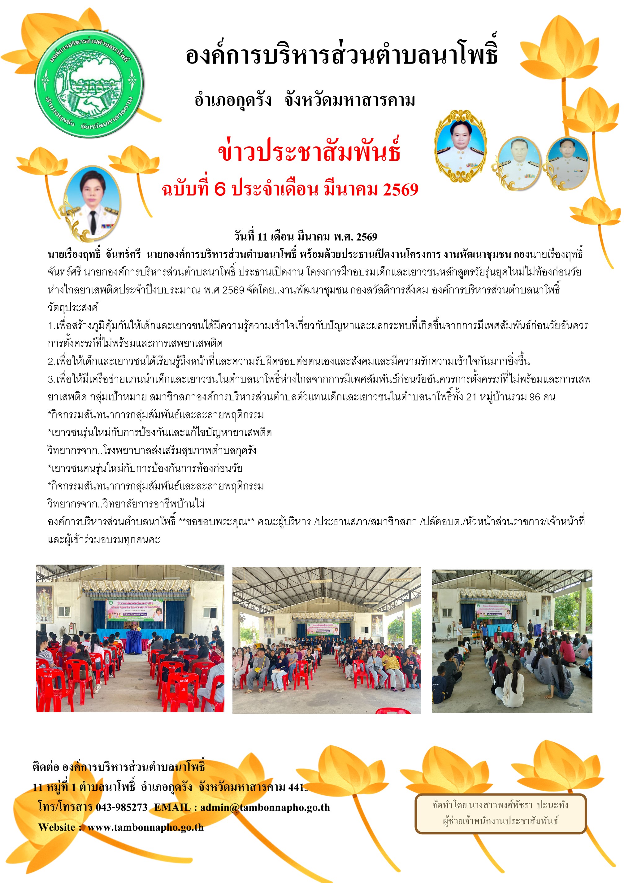 นายเรืองฤทธิ์ จันทร์ศรี นายกองค์การบริหารส่วนตำบลนาโพธิ์ พร้อมด้วยประธานเปิดงานโครงการ งานพัฒนาชุมชน กองนายเรืองฤทธิ์ จันทร์ศรี นายกองค์การบริหารส่วนตำบลนาโพธิ์ ประธานเปิดงาน โครงการฝึกอบรมเด็กและเยาวชนหลักสูตรวัยรุ่นยุคใหม่ไม่ท้องก่อนวัยห่างไกลยาเสพติดประจำปีงบประมาณ พ.ศ 2569 จัดโดย..งานพัฒนาชุมชน กองสวัสดิการสังคม องค์การบริหารส่วนตำบลนาโพธิ์