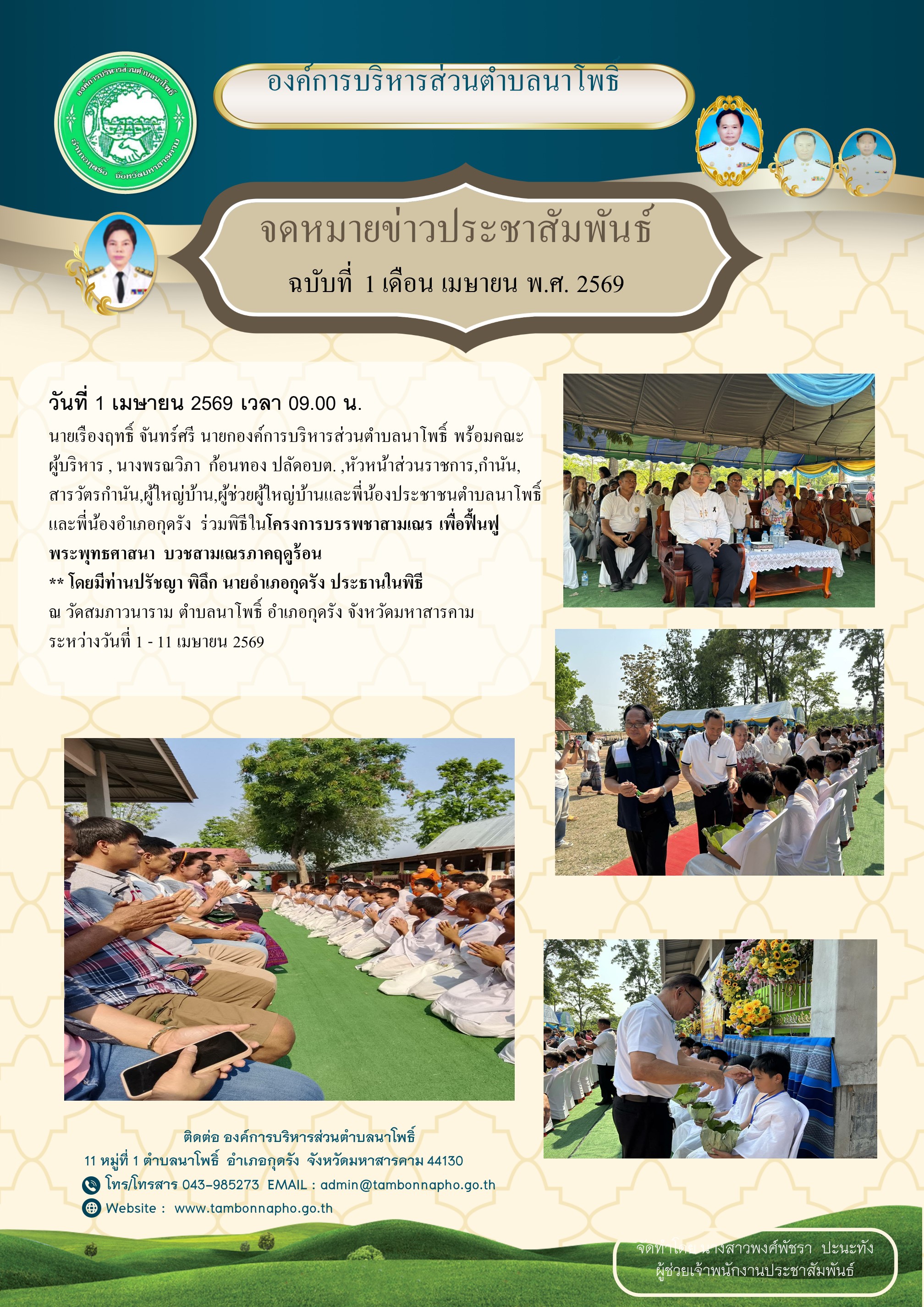 ผู้ช่วยผู้ใหญ่บ้านและพี่น้องประชาชนตำบลนาโพธิ์ และพี่น้องอำเภอกุดรัง ร่วมพิธีในโครงการบรรพชาสามเณร เพื่อฟื้นฟูพระพุทธศาสนา บวชสามเณรภาคฤดูร้อน