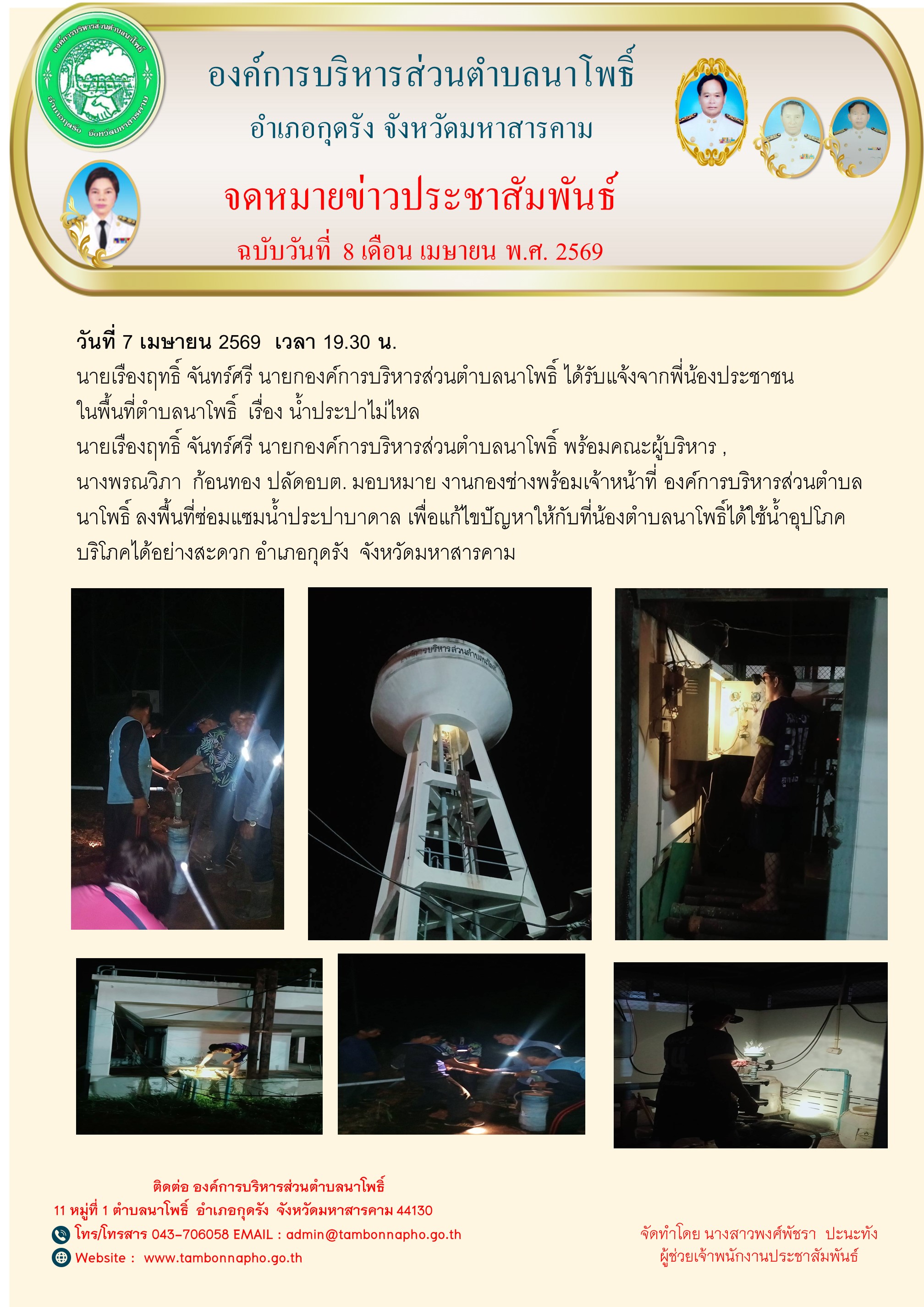 นางพรณวิภา ก้อนทอง ปลัดอบต. มอบหมาย งานกองช่างพร้อมเจ้าหน้าที่ องค์การบริหารส่วนตำบลนาโพธิ์ ลงพื้นที่ซ่อมแซมน้ำประปาบาดาลขนาดใหญ่มาก ตลาดกลางบ้านหนองแหน เพื่อแก้ไขปัญหาให้กับที่น้องตำบลนาโพธิ์ได้ใช้น้ำอุปโภคบริโภคได้อย่างสะดวก อำเภอกุดรัง จังหวัดมหาสารคาม