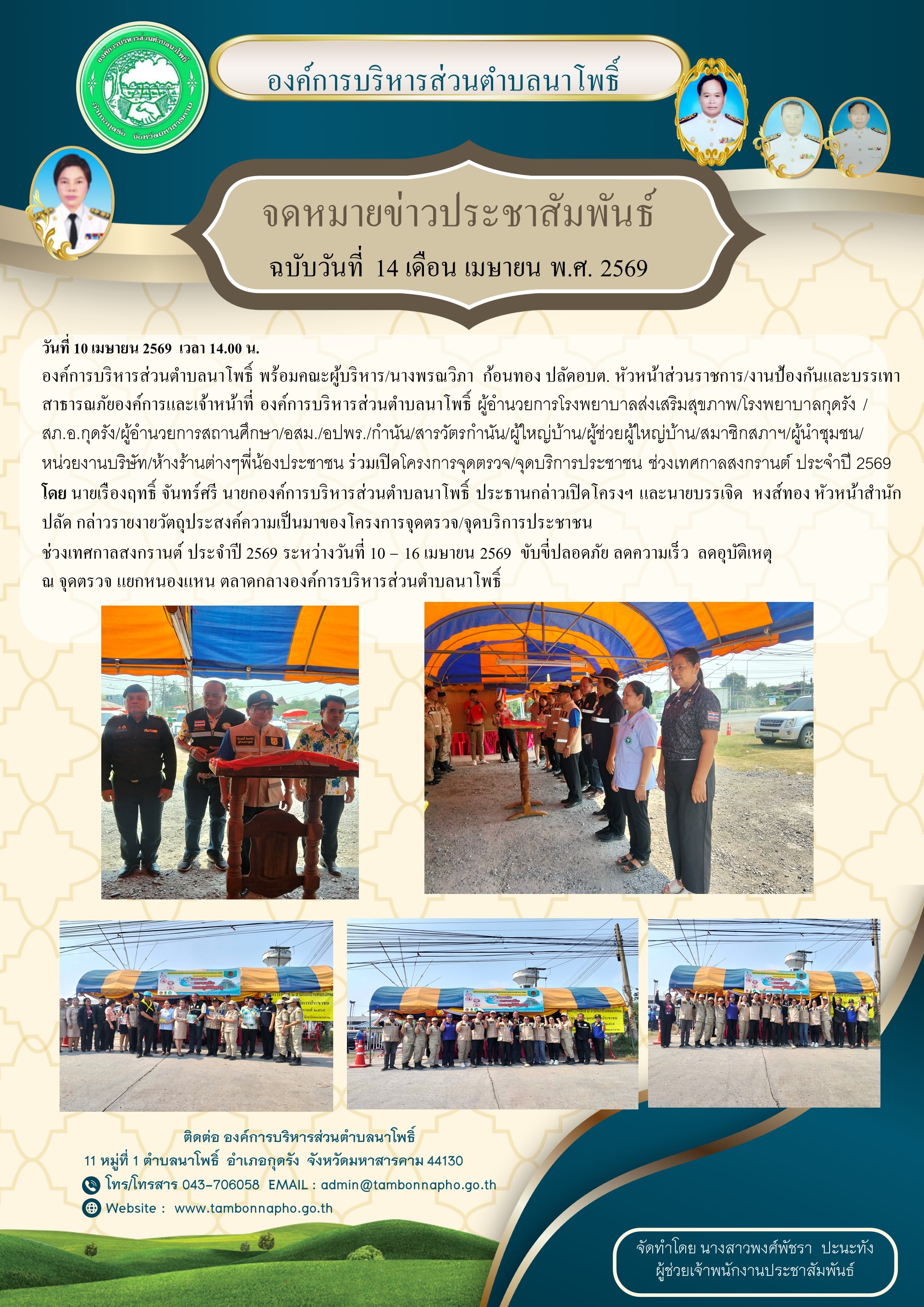 องค์การบริหารส่วนตำบลนาโพธิ์ พร้อมคณะผู้บริหาร/นางพรณวิภา ก้อนทอง ปลัดอบต. หัวหน้าส่วนราชการ/งานป้องกันและบรรเทาสาธารณภัยองค์การและเจ้าหน้าที่ องค์การบริหารส่วนตำบลนาโพธิ์ ผู้อำนวยการโรงพยาบาลส่งเสริมสุขภาพ/โรงพยาบาลกุดรัง /สภ.อ.กุดรัง/ผู้อำนวยการสถานศึกษา/อสม./อปพร./กำนัน/สารวัตรกำนัน/ผู้ใหญ่บ้าน/ผู้ช่วยผู้ใหญ่บ้าน/สมาชิกสภาฯ/ผู้นำชุมชน/หน่วยงานบริษัท/ห้างร้านต่างๆพี่น้องประชาชน ร่วมเปิดโครงการจุดตรวจ/จุดบริการประชาชน ช่วงเทศกาลสงกรานต์ ประจำปี 2569 โดย นายเรืองฤทธิ์ จันทร์ศรี นายกองค์การบริหารส่วนตำบลนาโพธิ์ ประธานกล่าวเปิดโครงฯ และนายบรรเจิด หงส์ทอง หัวหน้าสำนักปลัด กล่าวรายงายวัตถุประสงค์ความเป็นมาของโครงการจุดตรวจ/จุดบริการประชาชน