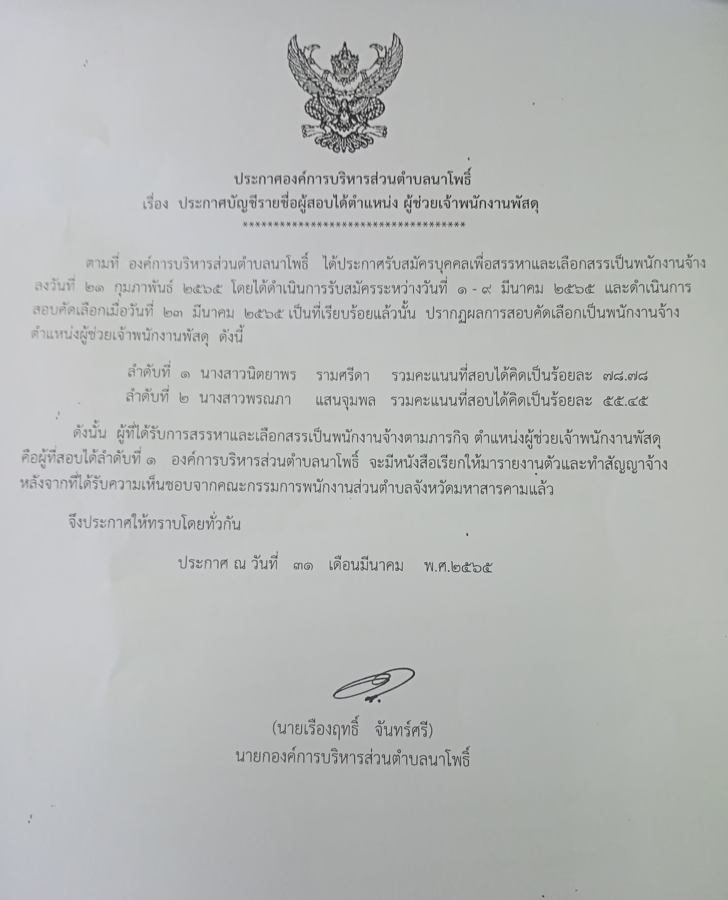 ประกาศ อบต.นาโพธิ์ เรื่อง ประกาศบัญชีรายชื่อผู้สอบได้ตำแหน่ง ผู้ช่วยเจ้าพนักงานพัสดุ |